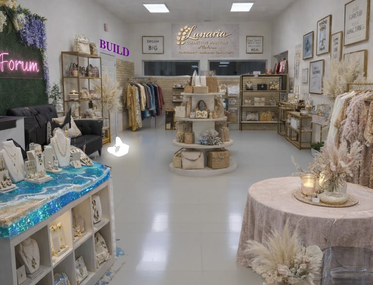 Named after the Lunaria flower — a symbol of prosperity, truth, and moving forward — our boutique is a space for creative entrepreneurs to grow. Here, you can create your products and sell them in the same place. No more kitchen table takeovers. No storage wars in your living room. Just a beautiful, supportive space where your work gets the spotlight it deserves.